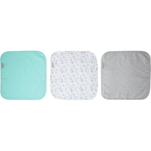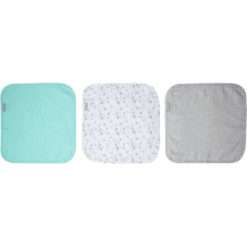 Een set van drie bébé-jou hydrofiele doekjes met vrolijke print.