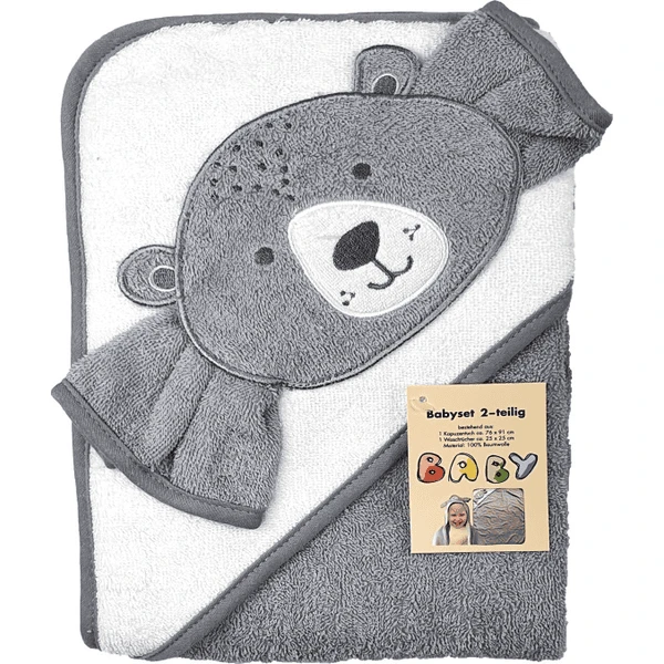 Tweedelige wasset met schattige berenapplicatie gemaakt van zacht biologisch katoen. Deze set bestaat uit een grijze badhanddoek met capuchon en een wit washandje. Materiaal: 100 % biologisch katoen Wasbaar bij 30 °C Geschikt voor de droger