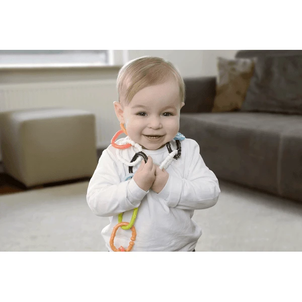 - De 12 kleurrijke ringen kunnen worden samengevoegd om de ketting aan de buggy of het kinderbedje te bevestigen