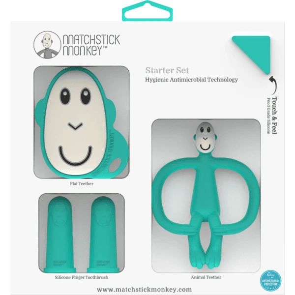 - De bijt set van Matchstick Monkey bestaat uit twee kindvriendelijk ontworpen bijtringen en twee vingertandenborstels