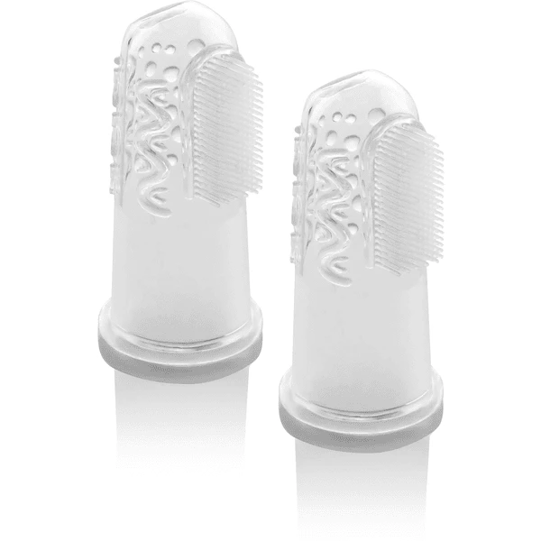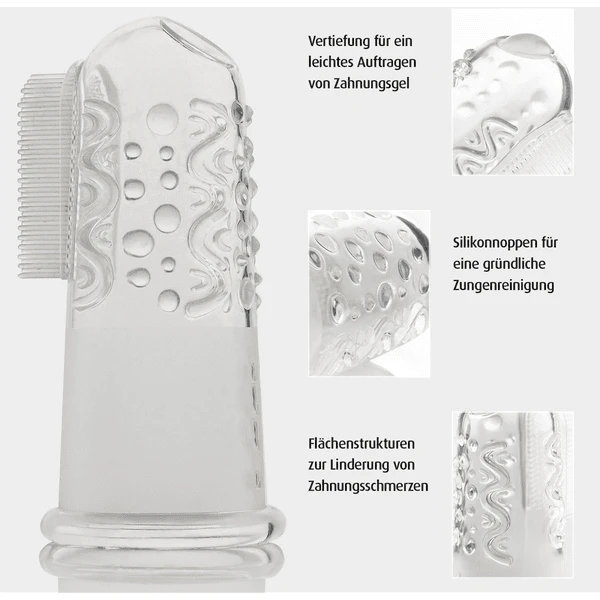 De vingertandenborstel is uitgerust met verschillende massagestructuren. Deze zorgen voor een aangename verlichting van de pijn bij het doorkomen van tandjes door hun gevarieerde massage-effect. De geïntegreerde uitsparing maakt het ook gemakkelijker om bijtende gel aan te brengen. Speciale siliconen nopjes zorgen voor een effectieve mondhygiëne – ze maken een eenvoudige maar grondige tongreiniging mogelijk.