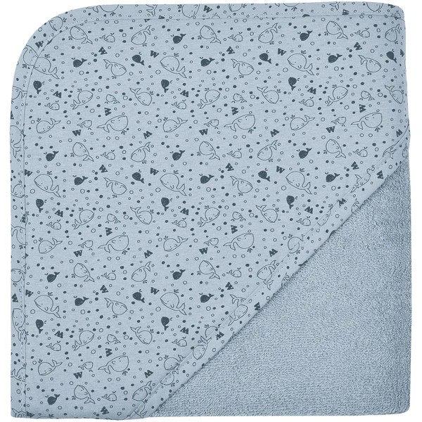 Mooie badhanddoek met kap, gemaakt van pluizige badstof met twee lagen capuchon. De bovenste laag van de kap heeft een prachtig walvismotief.
